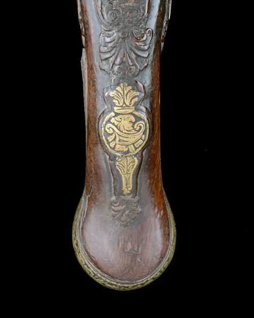 central European circa 1750, with round slightly swamped 12 1/2in. barrels, raised carved centre-ribs with engraving, further engraving to the breeches (rubbed), flat step-tailed lockplates signed 'PATATEEN LAMOURS' (sic), rain-proof pans, walnut full-stocks with floral carving around the top-tang and along the backs surrounding moulded escutcheons with yellow-metal inlay, similarly inlaid iron butt-caps with long side-spurs, en-suite trigger-guard tangs and bow, further carving to the fore-end and ramrod channels, iron barrel shaped thimbles and replacement wooden ramrods