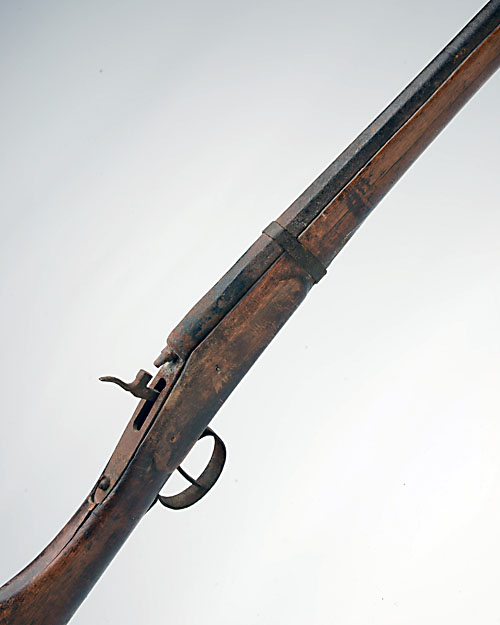A COMPOSED PAIR OF 18-BORE PERCUSSION MUSKETS, UNSIGNED, no visible serial number, possibly Mau-Mau, locally produced with approximately 41in. barrels, central hammers and wood three-quarter stocks