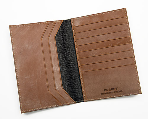 handmade from bridle leather, with three separate documents holders, large note section, and provision for eight credit cards, marked Purdey