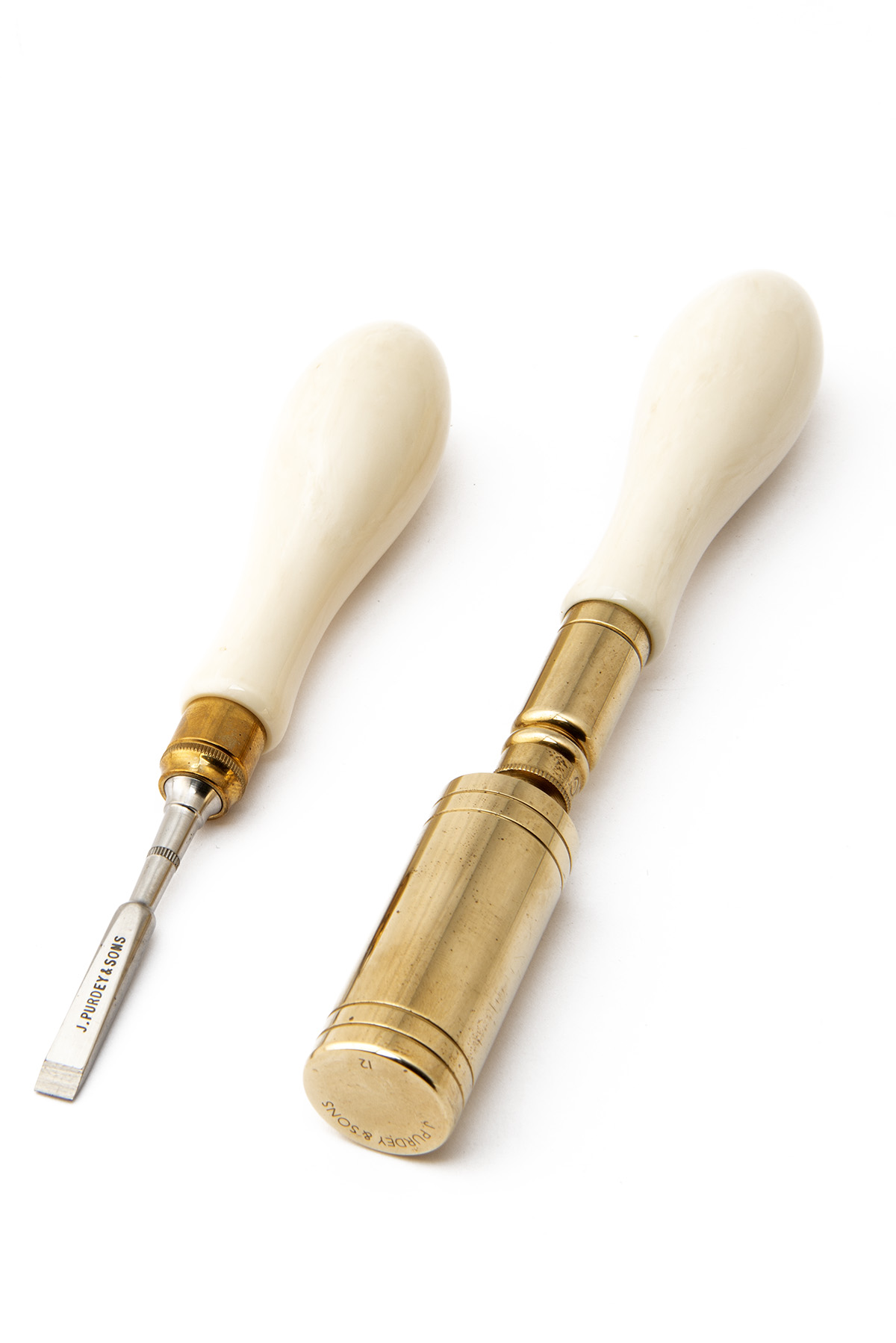 comprising of a three-piece brass and nylon cleaning rod, a 12-bore chamber brush, a medium turn-screw, all signed J. Purdey & Sons, all with ivorine handles