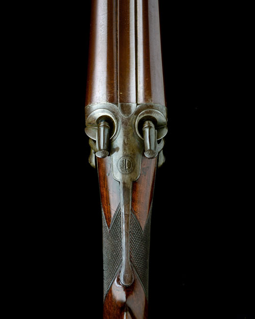 29 1/2in. (shortened) twist barrels, broad rib engraved ''W.S. RILEY. EAGLE GUN WORKS. BIRMINGHAM', (very faint), Jones patent rotary-underlever, carved percussion fences with mushroom hammers, non-rebounding back-action locks, border engraving, some patination overall, 14 3/8in. stock including steel buttplate, fore-end with horn finial, weight 16lb. 12oz.