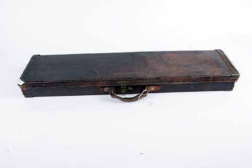 ** A BRASS-CORNERED SINGLE LEATHER GUNCASE, fitted for 32in. barrels, the interior lined with red baize (moth damage), brass lock (key missing), repaired handle, repaired corners