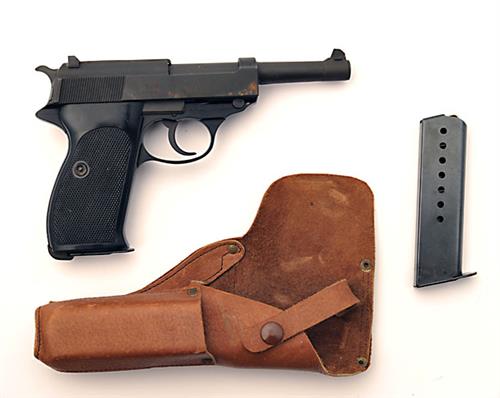 ** A 9mm (PARA) SEMI-AUTOMATIC PISTOL SIGNED WALTHER, MODEL 'P1', serial no. 303201, for 1975, with phosphated 5in. barrel, phosphated slide, anodised alloy frame and chequered black plastic grips, with a leather belt holster and spare magazine