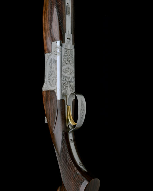 27 1/2in. nitro barrels with 13mm ventilated matt top-rib, 2 3/4in. chambers, bored approx. imp. cyl. choke in both, hold-open toplever, manual safety with integral barrel selector switch, gold-washed trigger, bold scroll engraving surrounding game scenes of pheasant and wildfowl, signed 'R. BEE', bright finish, 14 1/4in. figured pistolgrip stock including Browning buttplate, weight 7lb. 8oz., in a case
