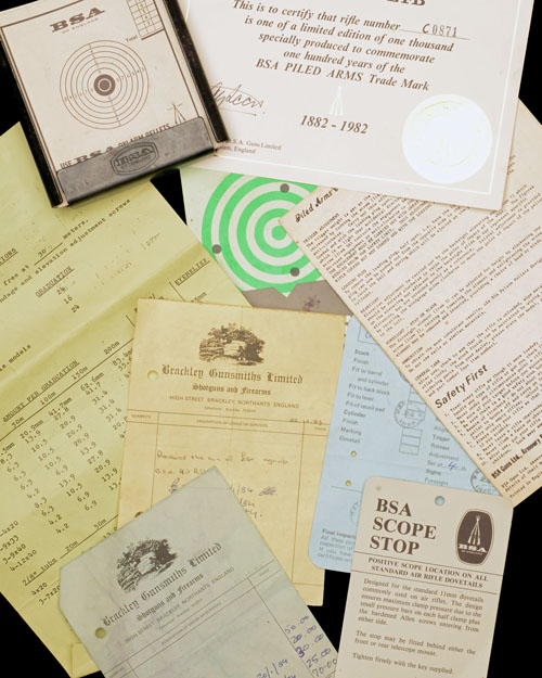 one of one thousand rifles made to celebrate the 100th anniversary of BSA in 1982, with blued 19 1/2in. barrel, ramp fore-sight, micro-adjustable rear-sight, tap-action loading, the air-chamber marked 'BSA PILED ARMS CENTENARY ONE OF ONE THOUSAND', special edition chequered walnut three-quarter stock with raised comb and cheek-piece, pistol-grip capped with special 'BSA piled arms' cover, ventilated rubber recoil pad, rosewood schnabel fore-end tip; TOGETHER WITH its original issue boxed 'BSA' 4x40 telescopic sight and mounts, its original limited edition certificate and papers, original vinyl gunbag (carry handles missing) and target holder, the whole contained within the original makers carton (stained, lid corners gone)