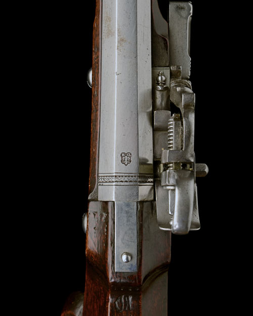 dated for 1667, probably Southern German with brushed-bright 36 1/4in. swamped micro-rifled octagonal barrel, brass dove-tailed blade fore-sight, large dove-tail for rear-sight (missing), the breech struck with an 'A-H' makers mark within a shield and engraved with a band, plain solid top-tang fixed from beneath, plain polished angular lockplate, framed external wheel, hammer with squared jaws and coiled spur, carved hammer-spring, pan with large flash-guard and automatic cover, walnut full-stock with angular butt, dated behind the top-tang, sliding patch-box to right hand side of butt, horn heel-plate with iron button at heel, lightly carved decoration to the borders, oversized trigger-guard bow with double-set 'hogs-bristle' trigger, moulded ramrod channel, bone front-pipe, horn fore-end tip and bone-tipped ramrod