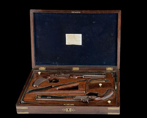 retailed by Thomas Blissett, Liverpool circa 1850, the two pistols with round, slightly tapering browned twist-iron 10in. barrels with engraved steeples terminating in starbursts, silver bead fore-sights, colour-hardened breech-blocks with engraved bands, gold lines and carved fences, fully engraved top-tangs, border engraved lockplates signed 'SOUTHALL' with isolated areas of scroll engraving, scroll engraved slab-sided hammers, figured walnut half-stocks with chequered bag-shaped butts (one with engraved iron mount for a shoulder-brace), white-metal escutcheons engraved with the crest of Sir Roger Palmer Bart., scroll engraved blued square-backed trigger-guard bows, pineapple finials, brass-tipped ebony ramrods, both pistols in fine condition with much original colour; TOGETHER WITH a period rosewood brass-bound storage case lined in blue-black velvet and compartmented in the Continental style with walnut veneer, retailers label to inside of lid and including a walnut skeleton shoulder brace, powder-flask, scissors ball-mould and cleaning rod