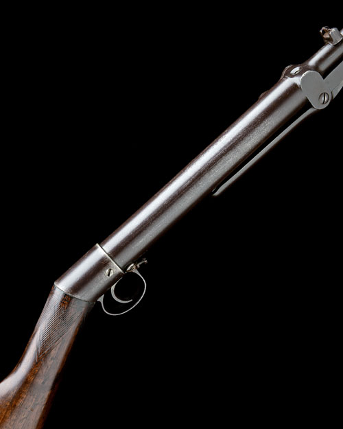 for 1908, with 19 1/4in. barrel (43in. overall), dove-tailed fore-sight, elevating rear-sight, rotating loading-tap with lever, plain air chamber marked 'THE BSA AIR RIFLE, (IMPROVED MODEL D)' and 'MADE BY THE BIRMINGHAM SMALL ARMS COMPANY LIMITED' over 'SOLE MANUFACTURERS', straight-hand walnut butt-stock chequered at the grip, BSA 'Piled Arms' trademark stamped to left side of butt, iron heel-plate and cast trigger-guard, the under-lever with 'spade' style release and stamped 'LINCOLN JEFFRIES PATENT 8761/04', strong traces of finish,