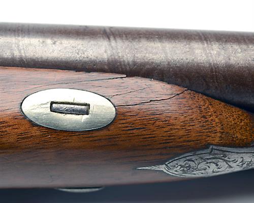 A CASED 18-BORE PERCUSSION SIDE-BY-SIDE RIFLED HOWDAH-PISTOL, no visible serial number,