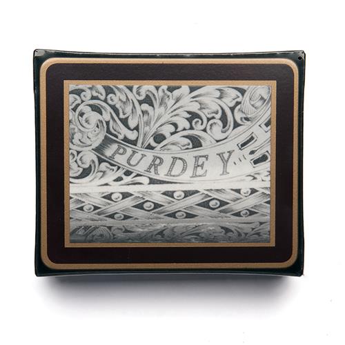 each with an image of a Purdey shotgun, housed in a canvas Purdey box, together with a set of matching drinks placemats