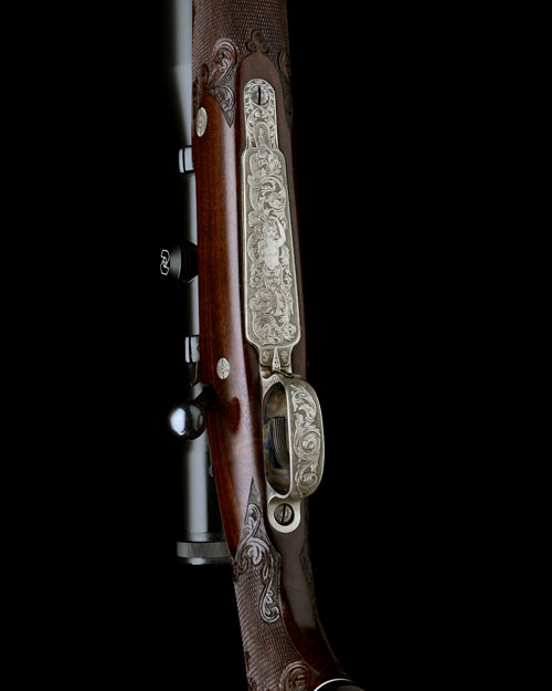 23 1/2in. nitro barrel with block-mounted open sights with folding leaf sight, marked for 100 and 200 metres, ramp-mounted bead fore-sight, the receiver mounted with a Zeiss Diatal-ZA 6x42 telescopic sight in quickly-detachable mounts, the receiver, bolt and furniture carved in high relief with rococo scrolls and designs and a Griffin on a finely matted background, hinged floorplate with push button release engraved en suite with central depiction of a Nereid, engraved recoil blocks, figured pistolgrip stock with cheekpiece, monte carlo comb, sling eyes, pistolgrip-cap, chequering with acanthus bordering, 14 1/2in. pull including 7/8in. ventilated rubber recoil pad