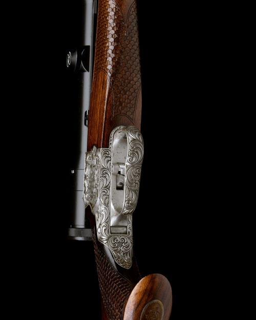 25 7/8in. Bohler Rasant-steel octagonal nitro barrel with matt top-rib, open sights and ramped blade fore-sight, the breech end mounted with a Zeiss Diavari-Z 1,5...6x42 telescopic sight in quickly-detachable mounts, manual side safety, the action and furniture carved with bold acanthus scrollwork surrounding central scenes of barking stag and wild boar carved in high relief, 14 5/8in. figured stock with sculpted cheekpiece, hogsback comb, birdshead pistolgrip, fish scale chequering, sling swivels and including 7/8in. ventilated rubber recoil pad, weight 8lb. 2oz.