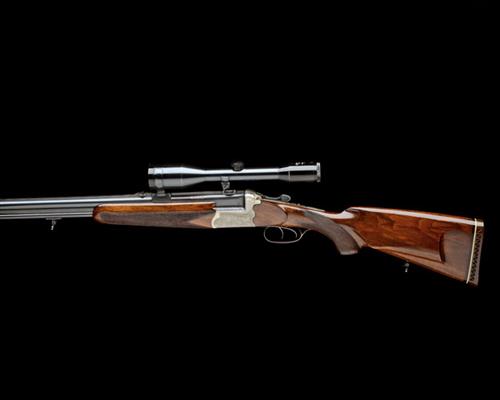 25 1/2in. nitro reproved barrels (in 2015) with stepped matt top-rib gold-inlaid 'FANZOI - FERLACH', flip-up open sights and ramped bead fore-sight, the breech end engraved 'MADE FOR S.C.A.M. MILANO' and mounted with a Swarovski Habicht 6 telescopic sight in quickly-detachable mounts, scroll-back quadruple-grip action with side-bolsters, removable striker discs, manual safety, set front trigger, Germanic scroll engraving with game scenes of roe deer and chamois, German silver finish, 14 3/8in. pistolgrip stock with sculpted cheekpiece, pistolgrip-cap, sling swivels and including 7/8in. ventilated rubber recoil pad, weight 8lb. 8oz.