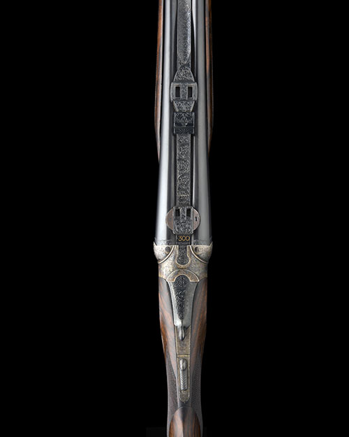 23 7/8in. replacement nitro barrels (in 1974) with deeply scroll-engraved sight rib, open sights and block-mounted blade fore-sight (with high visibility insert), flip-up moonsight and folding protector hood, the breech end gold-inlaid '.300' the concave rib engraved 'WESTLEY RICHARDS & CO. ENGLAND', the breech end mounted with a Zeiss Varipoint VM 1,5-6x42T* telescopic sight in quickly-detachable mounts, side-clipped treble-grip action incorporating J. Deeley and L.B. Taylor patent hand-detachable locks, patent no. 17731 of 28th July 1897 with improved 'lighter pull-off' modification, patent no. 10567 of 7th May 1907, use number 2793, striker discs, hinged floorplate, manual safety with gold-inlaid 'SAFE' detail, border and bold acanthus scroll engraving, retaining some renewed colour-hardening and finish, 15 1/2in. figured replacement pistolgrip stock with cheekpiece, sling swivels, pistolgrip-cap and including 1in. rubber recoil pad, matching replacement semi-beavertail fore-end wood, weight 10lb. 9oz., in a modern velvet-lined leather case; together with its original well-figured pistolgrip stock with cheekpiece, monte carlo comb, pistolgrip-cap, (missing escutcheon and swivels), approx. 14 1/2in. including 1in. rubber recoil pad