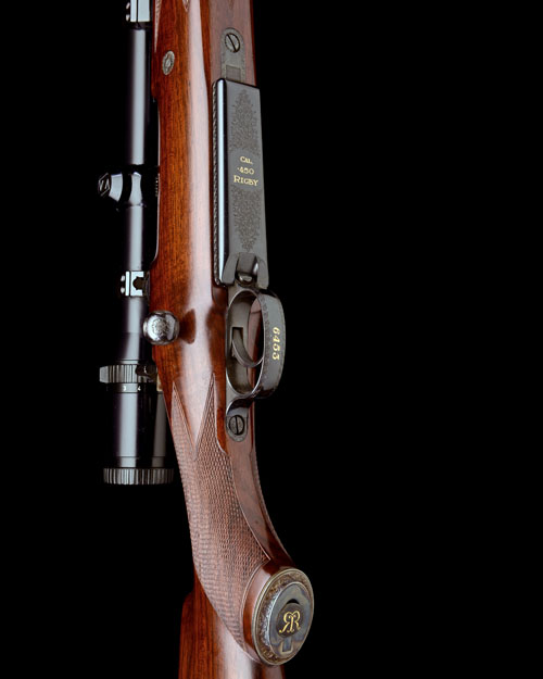 23 1/8in. nitro barrel engraved in gothic script 'JOHN RIGBY & CO. LONDON. ENGLAND', short filed sight rib with open sights and one folding leaf sight with gold-inlaid sight lines and marked 100 and 200, ramp-mounted bead fore-sight with protecting hood, the receiver mounted with a Zeiss Diavari-Z 1,25-4x24T* telescopic sight in quickly-detachable mounts (engraved with the makers name and serial number), receiver ring engraved 'RIGBY'S SPECIAL .450 BORE FOR BIG GAME', rear of bolt with colour-hardened finish and gold-inlaid 'SAFE' detail, bolt handle with chequered panels, florally-engraved recoil blocks, hinged straddle floorplate with push button release, engraved with acanthus scrollwork and gold-inlaid with the calibre designation, the triggerguard gold-inlaid with the serial number, figured pistolgrip stock with cheekpiece, sling eyes, engraved and colour-hardened steel pistolgrip-cap with matted trap gold-inlaid with the Rigby trademark, 14 7/8in. pull including 3/4in. rubber recoil pad