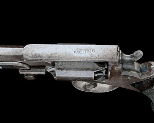 circa 1858, with octagonal 6in. barrel, the top-strap marked 'MANUFACTURED BY MASS. ARMS CO. CHICOPEE FALLS', dove-tailed bead fore-sight, standing notch rear-sight, plain cylinder with wingnut release, solid iron frame with narrow side-plate, the base of frame stamped 'ADAMS PATENT MAY 3D 1858' on the left and 'PATENT JUNE 3D 1856' on the right, double-action trigger with spurred hammer, chequered walnut grip with lanyard hole and iron butt-cap, the left side of barrel mounted with 'KERR'S' patent rammer
