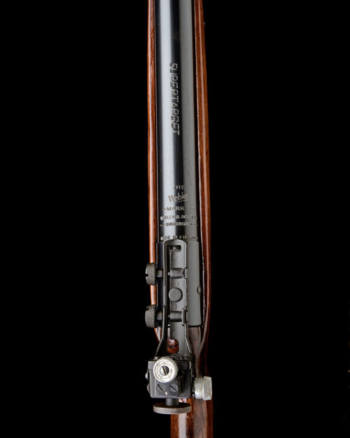 circa 1974, with blued, tapering 18 1/2in. barrel, tunnel fore-sight with removable element on a special dove-tail base, no provision for rear-sight, blued air-chamber, the mid-section stamped 'SUPERTARGET', the rear with the make and model details forwards of the trigger-block, the top of trigger block mounted with a short rail and fitted with a period 'Anschutz' diopter match rear-sight, varnished walnut half-stock with plastic circular 'WEBLEY' medallion inlet to left hand side of butt, blued under-lever with push-button release, the whole in fine condition