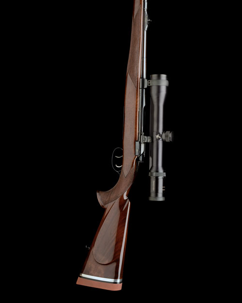 21 1/4in. nitro barrel with block-mounted open sights and ramp-mounted bead fore-sight, the receiver mounted with a Swarovski Habicht 1,5-6x42 telescopic sight in quickly-detachable mounts, detachable box magazine, set triggers, full length pistolgrip stock with cheekpiece, sling swivels, 14in. pull including 1 1/4in. rubber recoil pad