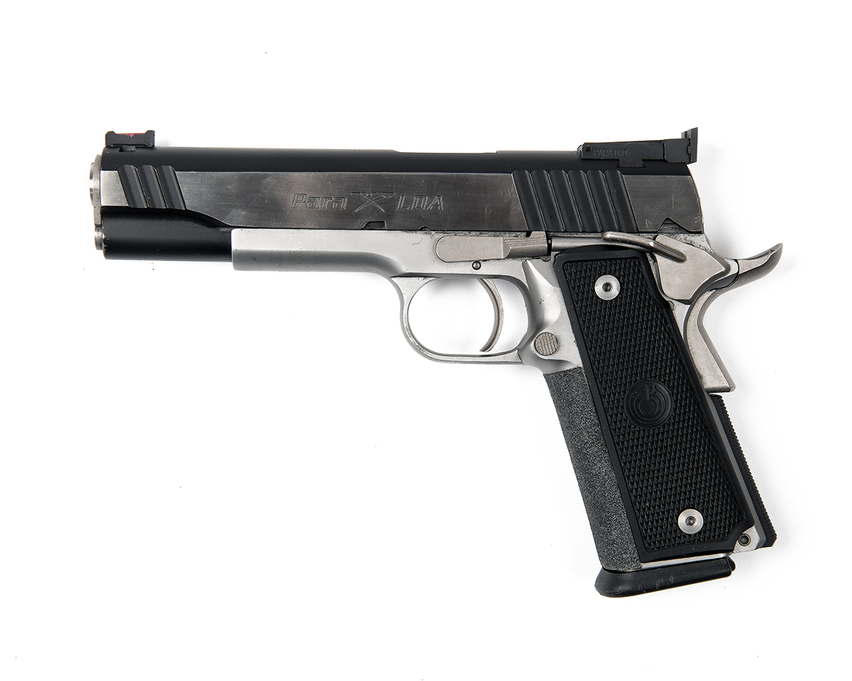 with stainless 5in. barrel, stainless slide machined with blackened thumb-grips front and back and fitted with Para-Ordnance adjustable sights, stainless frame with chequered back-strap, ambidextrous safe, extended beaver-tail, special double action only hammer, chequered black plastic grips and bumpered magazine