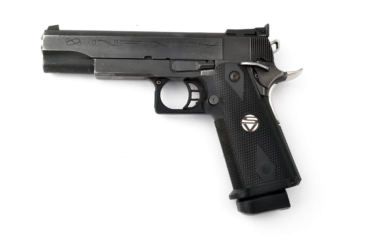 A SPECIAL .355 (AUTO) HIGH CAPACITY PISTOL SIGNED STRAYER-VOIGT, MODEL 'INFINITY', serial no. GILL-3, specially constructed and numbered for the original owner, with 5in. custom barrel, blued slide with adjustable sights, steel and polymer frame with chequered straps and grips, hi capacity magazine with bumper at heel
