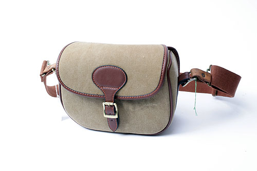 A CANVAS AND LEATHER CARTRIDGE BAG, with canvas and leather shoulder strap, brass fittings