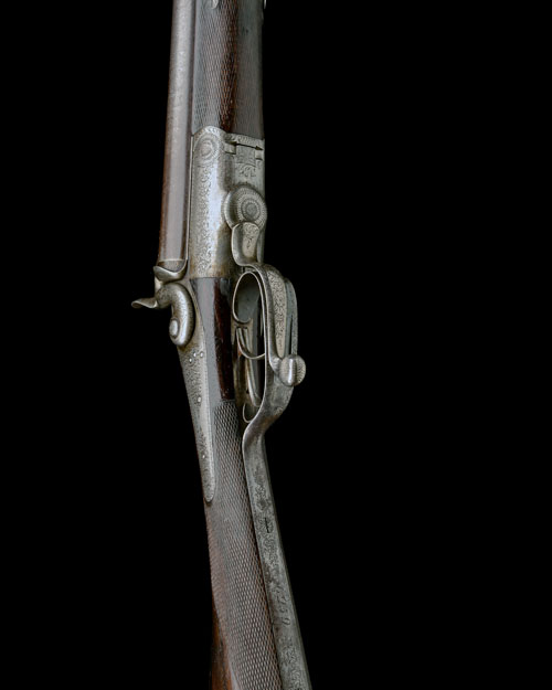 for 1861/62, with fine damascus browned 31in. barrels, the top-rib signed 'J. PURDEY, 314 1/2 OXFORD STREET, LONDON' (rubbed), engraved standing breech forwards of the carved percussion fences, full rose-scroll engraved long top-tang, border and scroll engraved back-action locks signed 'PURDEY', scroll engraved dolphin-headed hammers, walnut chequered straight-hand butt-stock with iron heel-plate, iron trigger-guard with 'Jone's' type swing under-lever, rounded scroll engraved action, fully chequered splinter fore-end, traces of original finish in sheltered areas