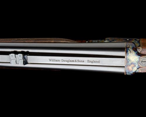 23 1/2in. nitro barrels (London proof 1996) with sight rib engraved 'WILLIAM DOUGLASS & SONS. ENGLAND.', open sights and folding leaf sights for 100 and 200 yards, ramp-mounted bead foresight, stepped treble-grip action with removable striker discs, manual safety, border engraving, the underside engraved 'WILLIAM DOUGLASS & SONS. LONDON.', retaining virtually full original colour-hardening and finish, 15in. well-figured pistolgrip stock including 7/8in. rubber recoil pad, semi-beavertail fore-end with grip-catch release, weight 10lb. 13oz.