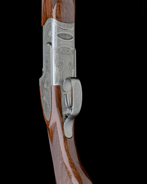 30in. nitro barrels with 7mm ventilated matt top-rib, 3in. chambers, multichokes (with spares), hold-open toplever, manual safety with integral barrel selector switch, acanthus scroll engraving surrounding scenes of woodcock and pheasant in flight in their naturalistic habitats, silver finish, 14 5/8in. figured semi-pistolgrip stock (cast for a left-hander) including 1/4in. wooden buttplate, weight 7lb. 7oz., in its makers case