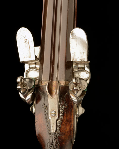 circa 1795, with slightly shortened 33 1/4in. octagonal to round sighted barrels with faded plum-coloured finish, silver-covered border engraved grooved tang, polished rounded border engraved locks respectively signed 'DECHANDON' and 'A ST. ETIENNE', well figured half-stock with raised cheek-piece, chequered grip and fore-end, carved in relief with a mask behind the grip and a dragon behind the cheek-piece, silver mounts including associated butt-plate with sprung hinged trap-cover moulded trigger-guard and ramrod throat, iron sling mounts, later bone-capped ramrod (some minor surface corrosion marking to locks, stock with insert repairs to fore-end and grip, chequering refreshed).