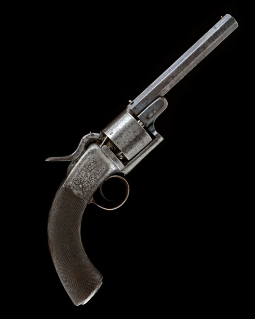 circa 1845, with octagonal 6in. sighted barrel, engraved band at muzzle, scroll engraving around the fore-sight bead, plain cylinder with engraved borderline to the leading edge, each chamber numbered respectively '1' through '6', rounded border and scroll engraved boxlock action with offset central hammer for sighting, finely chequered pistol-grip butt with inlet silver oval escutcheon at wrist, engraved iron butt-cap with central trapdoor for caps, guarded trigger, the whole with traces of finish; TOGETHER WITH its original mahogany storage case, lined and compartmented in green baize and containing a number of possibly associated accessories including an iron ball-mould ramrod combined, a powder-flask, turn-screw, oil-bottle, cap-tin and cleaning rod