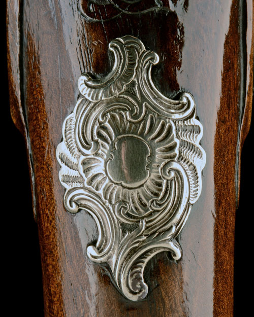 circa 1750, with slightly swamped iron 9 1/2in. barrels, carved sighting ribs signed 'A BAREVTH' (sic) and terminating in an applied brass boat-shaped fore-sight, carved short side-ribs, the top-tangs numbered '1' & '2' respectively, borderline engraved radiused locks, moulded supports to the pans, bridle-less frizzens, carved frizzen-springs, walnut full-stocks with carved borders around the furniture and ramrod channels, rococo embossed and shaped white-metal beaked butt-cap, escutcheon to wrist, side-nail escutcheons, trigger-guards and ramrod pipes, horn tipped fore-ends and associated ramrods