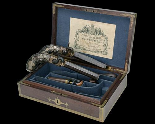 circa 1840, with octagonal iron turn-off 4 3/4in. barrels signed on the top-flats 'J. BLISSETT 322 HIGH HOLBORN LONDON' (darkly stained, bruised), silver fore-sight beads, engraved bands at muzzles, squared brass boxlock side-hammer actions with radiused edges and scroll engraving, the top-plates with standing notch rear-sights, walnut butts profusely inlaid with white-metal vines and leaves (losses), large cornucopia to the heels, engraved white-metal butt-caps with central trapdoors, concealed folding triggers and London proofs; TOGETHER WITH their makers brass bound mahogany case, the outer lid with flush fitting brass handle, the mount of which engraved 'CAPT J. GALLWEY, 16TH REGT.', possible replacement parchment label to inside of lid, the lower tray lined and compartmented in blue baize and containing a number of period accessories including an earlier three-way flask