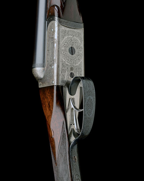 28in. sleeved nitro barrels (in 2000), rib re-engraved 'WILLIAM EVANS FROM PURDEY'S 63 PALL MALL ST. JAMES'S. LONDON.', 2 3/4in. chambers, bored approx. imp. cyl. and 1/2 choke, treble-grip action with removable striker discs, intercepting sears, slender toplever, automatic safety with gold-inlaid 'SAFE' detail, fine floral and acanthus scroll engraving, the makers details (refreshed) in an elaborate cartouche, retaining very slight traces of original colour-hardening, 14 1/2in. well-figured stock including horn buttplate, bolstered fore-end, weight 6lb. 4oz.