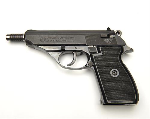 A .32 ACP (7.65mm) SEMI-AUTOMATIC PISTOL SIGNED HEGE, MODEL AP66, serial no. 1085706 THREADED FOR A SOUND-MODERATOR, German circa 1985, with 4 1/2in. barrel, grey phosphated slide, blacked alloy frame and black plastic chequered grips, missing magazine