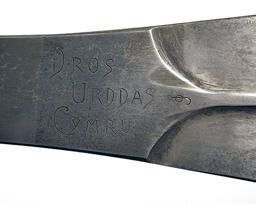 circa 1916, with substantial leaf-shaped 17 1/2in. blade, approximately 3in. wide at its broadest, with carved central reinforcing rib flowing into the ricasso, one side stamped with a small 'JOUBERT & CIE' trademark, the other with a 'JO' monogram and inscribed 'DROS URDDAS CYMRU' (for the dignity of Wales), folding stepped circular iron cross-guard, rope-bound hilt, flattened oval integral pommel with skull-cracker spike and rope lanyard (some cleaning and frosting to blade); TOGETHER WITH its webbing bound leather scabbard with reinforced tip and leather belt-loop (belt loop broken through)