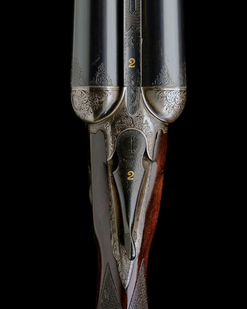 27in. Greener trade mark steel barrels with acanthus scroll detailing at the breech ends, matt rib gold-inlaid '2' and engraved 'W.W. GREENER. MAKER. 40. PALL MALL. LONDON. S.W. WORKS ST. MARY'S SQUARE. BIRMINGHAM.', 2 3/4in. chambers, bored approx. 1/4 and 3/4 choke, scoop-back treble-grip action with ropework engraved side shoulders, toplever gold-inlaid '2', manual side safety with gold-inlaid 'SAFE' detail, rolled-edge triggerguard, fine acanthus scroll engraving, retaining much original colour-hardening, 14 3/8in. well-figured 'rational' semi-pistolgrip stock including buttplate, fore-end with Deeley & Edge patent release catch (gold-inlaid '2') and horn finial, weight 6lb. 14oz., in a pigskin leather double-ended motor case with provision for cleaning equipment, together with an extra straight hand stock with diamond grip