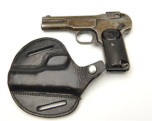 A .32 ACP (7.65mm) SEMI-AUTOMATIC PISTOL SIGNED FN, MODEL 1900 BROWNING, serial no. 57592, early type circa 1905 with 4in. barrel, and chequered hard-rubber grips embossed with a depiction of the pistol itself above an 'FN' monogram, finish worn, no magazine TOGETHER WITH a pancake holster (2)
