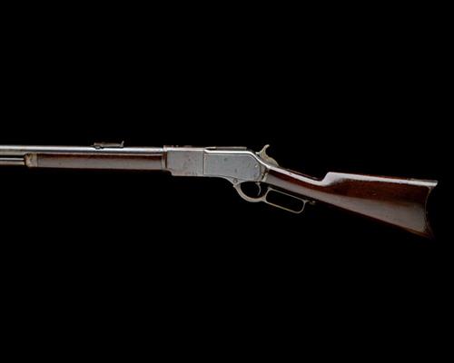 for 1879, with 28in. blued barrel signed 'WINCHESTER'S REPEATING ARMS. NEW HAVEN. CT.' with King's Improvement patent dates and signed 'WATSON. 4. PALL MALL. LONDON.', blade fore-sight, rear-sight calibrated to 1,000 yards and marked '1876', blued action with sliding dust-cover, hammer and lever each retaining some faint original case-hardened finish, walnut straight-hand butt-stock with crescent heel-plate and sliding trap-cover containing a Winchester four-piece cleaning rod, blued full-length tubular magazine, the whole retaining a fair amount of original blued finish.