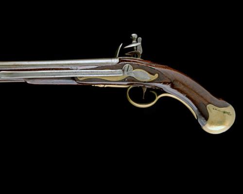 dated for 1800, with slightly swamped tapering 12in. iron barrel, moulded band and Tower proofs at breech, squared solid top-tang, flat lockplate with pointed tail signed 'TOWER', 'G.R.' and crown device forwards of hammer together with ordnance stamps, borderline engraved hammer, walnut full-stock with carved apron around the top-tang and small date stamp to top-right of wrist, 'WS' or '9' stamp behind side-plate, brass furniture, long iron belt-hook fixed to the left hand side, brass-tipped ramrod and further traces of inspector's marks to the ramrod channel