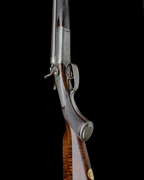 26in. black powder only barrels with raised, partially matted rib, open sights and two folding leaf sights with white metal inlaid sight lines and marked for 50/100, 200 and 250 yards, ramped bead fore-sight, slender treble-grip action with ornately carved percussion fences, elongated top tang, rebounding back-action locks with flat side dolphin hammers, fine acanthus scroll engraving, the left side of the action with charge and case length details, retaining slight traces of original colour-hardening, 14 3/4in. well-figured pistolgrip stock with cheekpiece, sling swivels, engraved steel pistolgrip-cap and including 3/4in. rubber recoil pad, weight 8lb. 9oz.