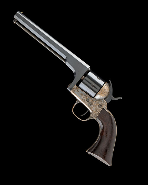 made between 1861 - 63, with re-finished 6in. octagonal barrel signed on the top-flat 'D. MOORE PATENT SEPT 18. 1860', bead fore-sight, rear-sight notch to the hammer nose, plain re-blued cylinder, brass border and scroll engraved frame with traces of silver plating, the rear of recoil shield with catch allowing the sideways turning of the barrel and cylinder for loading, smooth walnut grip and guarded trigger, under-barrel ejector rod
