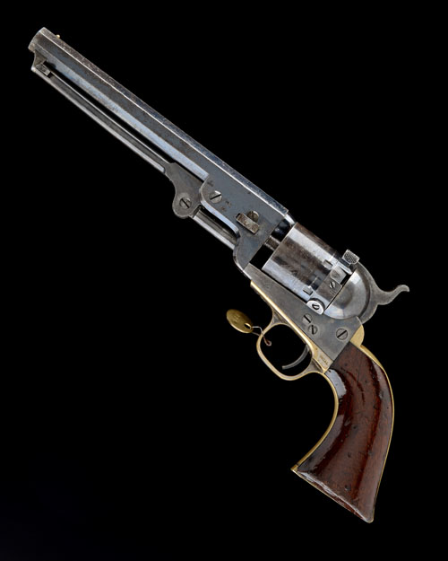 for 1869, and probably made as a conversion from new, with 7 1/2in. octagonal blued barrel signed 'ADDRESS COL SAML COL NEW-YORK U.S. AMERICA', blued cylinder with roll engraved naval scene, Thuer patent turning ring to rear of cylinder positionable for unloading or firing, colour-hardened open frame marked 'COLTS PATENT', colour-hardened hammer, brass grip-straps and trigger-guard (traces of silver plate), smooth walnut one-piece grip and articulated under-barrel loading lever, bluing to the barrel and cylinder with losses and fading but retaining much colour and finish, an unknown collection disk stamped '126' attached to trigger-guard