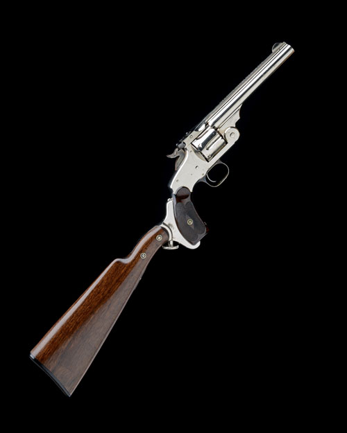 circa 1880, with nickel-plated 6 1/2in. barrel, raised sighting rib signed 'SMITH & WESSON' together with the address and patent dates to December 1877, ending in the wording 'REISSUE JULY 25 1871', pinned crescent fore-sight, standing notch rear-sight to the barrel-latch, fluted cylinder, break-open frame with automatic ejection, early type ejector housing with toothed cam-wheel, chequered walnut grips, the back-strap with aperture for shoulder-stock, the heel with small groove for same, colour-hardened trigger-guard bow and hammer, the whole retaining virtually all its original plated finish and appearing little used; TOGETHER WITH its boxed walnut shoulder-stock, the green paper covered card carton bearing an orange label at one end reading 'SMITH & WESSON, EXTENSION '44' STOCK, SINGLE ACTION NICKEL', the stock in fine condition with nickel-plated attachment and hard rubber chequered heel-plate with central 'S&W' trademark, also appearing little used