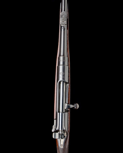 26 3/4in. nitro reproved barrel (smoothbored to .410 shot from .375 2 1/2in. Express calibre) engraved '.375 2 1/2IN. CASE. WILLIAM EVANS (FROM PURDEY'S) 63 PALL MALL. ST. JAMES'S. LONDON. 40 GRAINS CORDITE. 270 GRAIN BULLET', block-mounted open sights with to folding leaf sights, white metal inlaid sight lines and marked for 100, 200 and 300 yards, ramp-mounted bead fore-sight with flip-up moonsight, receiver ring engraved with a crown over 'Md. 1893', the sidewall engraved 'Steyr 1908', retaining some original blued finish, pistolgrip stock with sling eyes, horn pistolgrip-cap and finial, 14 1/2in. pull including steel buttplate