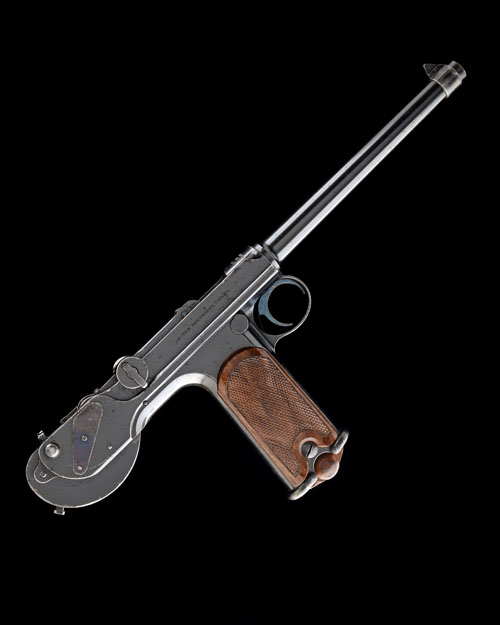 circa 1895, with 7 1/2in. sighted barrel, receiver-ring marked 'WAFFENFABRIK LOEWE BERLIN' and the side of the receiver marked 'SYSTEM BORCHARDT PATENT', the toggle marked 'D.R.P. NO. 75837', extension to the cocking piece on the left hand side, chequered walnut grips (much original finish with some small isolated corrosion spots, matching magazine)