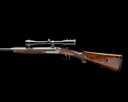 22 1/2in. nitro reproved octagonal to round barrel (chamber sleeved from a previous calibre) with matt sight rib, open sights and ramp-mounted bead fore-sight, the breech end engraved 'FRANZ SODIA - FERLACH', and mounted with a Swarovski 6x36A Habicht telescopic sight in quickly-detachable mounts, treble-grip action with carved percussion fence, rebounding back-action lock with sculpted hammer, set triggers, border and acanthus scroll engraving, the lockplate with a running deer and the makers name, bright and blued finish, 14 1/4in. pistolgrip stock with cheekpiece, sling eyes, pistolgrip-cap and including 7/8in. rubber recoil pad, weight 7lb.
