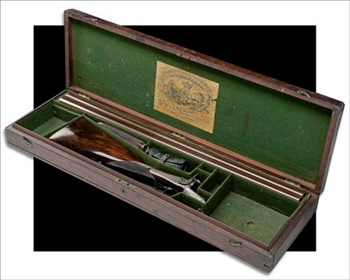 circa 1870, with re-browned 30in. damascus barrels, the top-rib with refreshed signature ' WILKINSON & SON, GUN MAKERS TO HER MAJESTY, PALL MALL LONDON', border engraving at breech-end, borderline, scroll and shell engraved long top-tang, border and scroll engraved rounded action body with engraved swing under-lever, border and scroll engraved back-action locks signed 'WILKINSON & SON, engraved dolphin headed hammers, figured walnut butt-stock chequered at the wrist, engraved blued butt-plate (rubbed), walnut chequered splinter fore-end, the whole re-finished; TOGETHER WITH a mahogany storage case, lined and compartmented in green baize and containing an additional walleted pull-through, the inner lid with parchment 'JOHN WILKINSON & SON' trade label