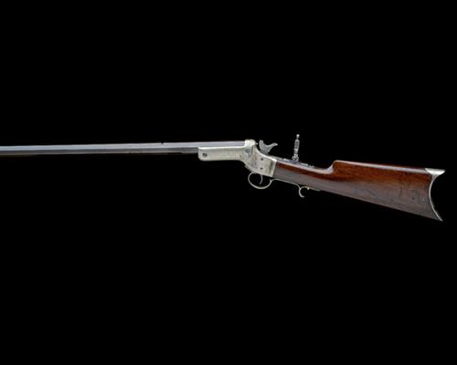 circa 1890, with octagonal 28in. blued barrel, the left-flat signed 'J. STEVENS & CO. CHICOPEE FALLS, MASS, PAT SEPT 6 1884', dove-tailed crescent blade fore-sight, ebony blanking plate to the rear-sight dove-tail, nickel-plated radiused central hammer action, the top-tang fitted with a 'Lyman' style column peep-sight, walnut butt with plated crescent heel-plate, no provision for fore-end, strong amount of original finish throughout