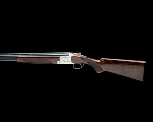 28in. nitro barrels with 13mm ventilated matt top-rib, 2 3/4in. chambers, bored approx. imp. cyl. and 1/4 choke, hold-open toplever, manual safety with integral barrel selector switch, gold-washed trigger, acanthus scroll engraving surrounding vignettes of flushed pheasant on the left, the right with a brace of flushed mallard, silver finish, 14 1/4in. figured pistolgrip stock including buttplate, weight 7lb. 8oz., in its makers faux fur-lined leather case