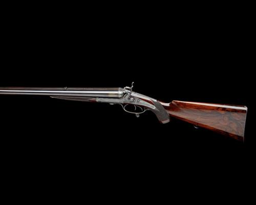 25 7/8in. black powder only barrels, raised matt rib engraved in gothic script 'JOHN RIGBY & CO. DUBLIN & LONDON', open sights and folding leaf sight, bead fore-sight, Jones patent rotary-underlever, carved percussion fences, non-rebounding back-action locks with bolted hammers, best fine border and acanthus scroll engraving, retaining some colour-hardening, 14 1/2in. well-figured pistolgrip stock with horn pistolgrip-cap, engraved steel sling button and chequered steel buttplate, fore-end with grip catch release lever, weight 8lb. 14oz.
